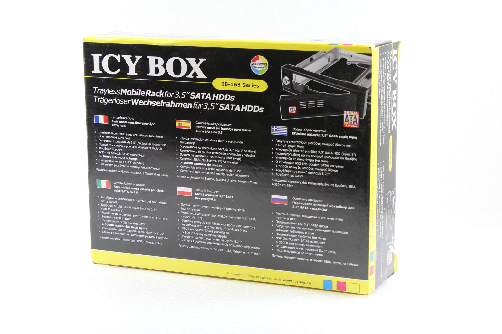 Features: Supper fast HDD installation and exchange without tray, Supports all 3.5-inch SATA (1 inch high) HDD in a 5.25 bay, Rubber cushion to avoid vibration and noise, Supports hot swap, NSS (No-Scratch SATA) connector 10.000 times HDD exchange, Key lock to prevent improper operation, Space Requirement: 1 x 5.25" Internal