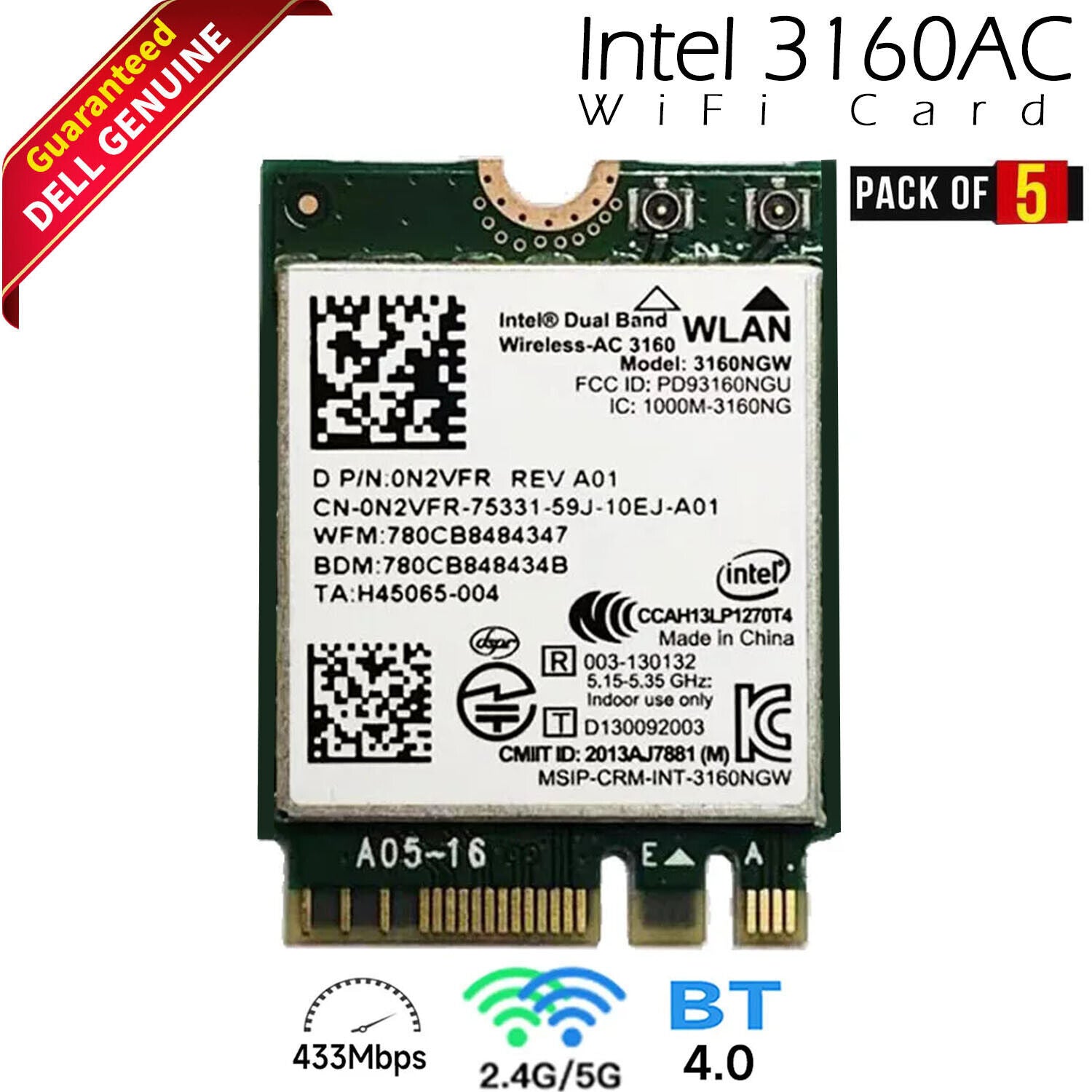 Lot X 5 Dell Intel Wireless-AC 3160 Dual Band WLAN WiFi Bluetooth M.2 Card N2VFR